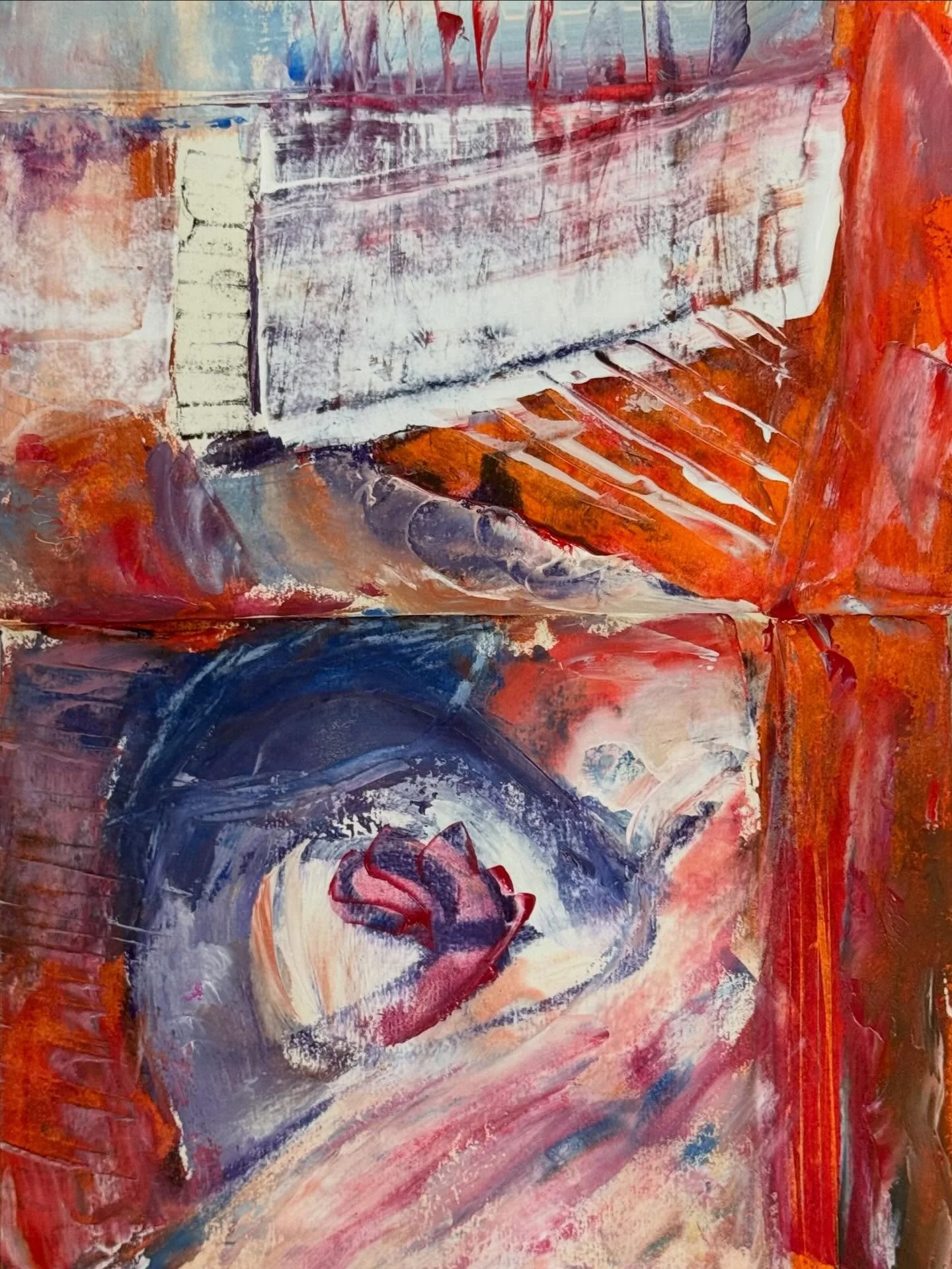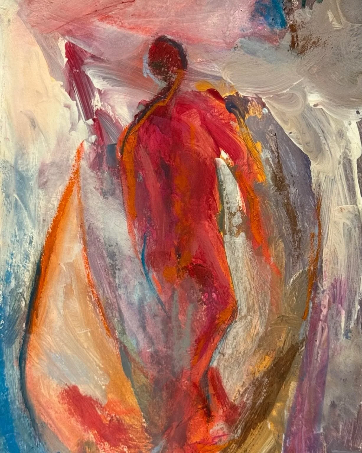 View fullsize What he took was himself - Mixed media (acrylic and oil pastel) on paper 30cm x 20 cm - escape,surrender or beginning?  #mixedmediapainting #artonpaper #intuitiveart #leaving #journeyoflife