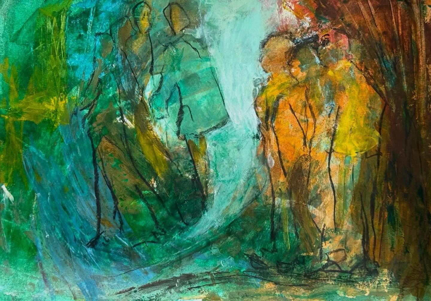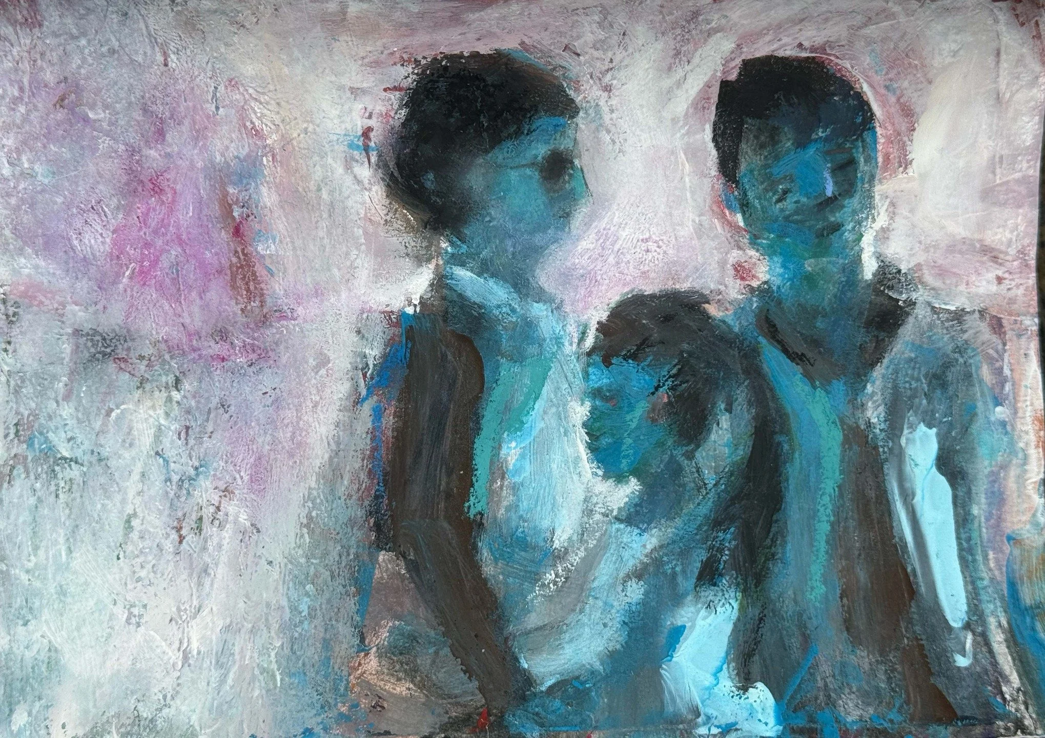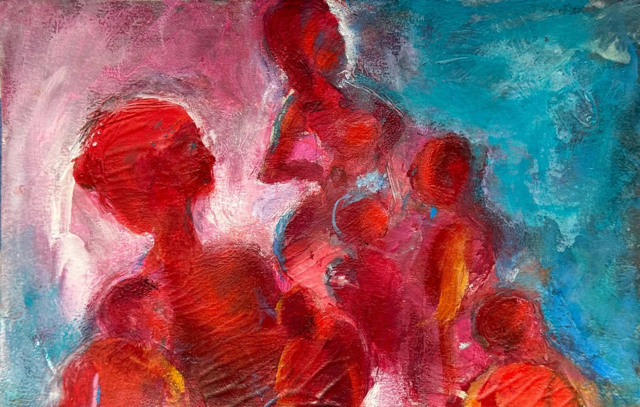 View fullsize 'The gathering' 13.8 x 21.4 cm mixed media oil and oil pastel on acrylic interlacing of generations, a ritual of closeness, pre-social, pre-political #contemporaryart #intuitiveart #mixedmediapainting#womensupportingwomen #originalart
